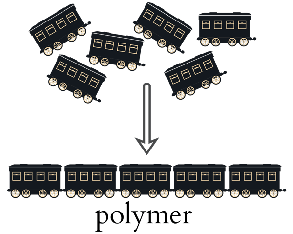 A polymer (“poly” = many, “mer” = unit) is simply a molecule that is made by joining many small, similar molecules together. Think of a train as an analogy: the train is a polymer made up of many train cars put together.